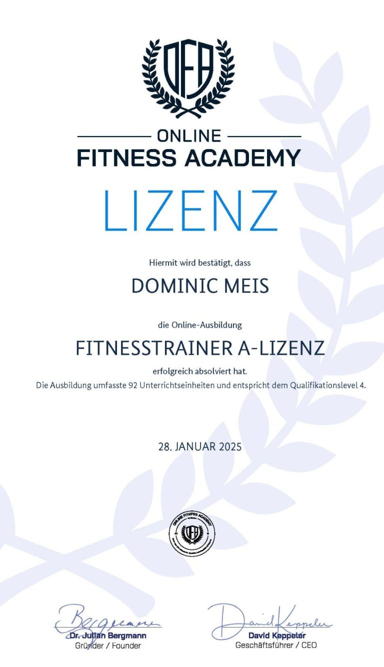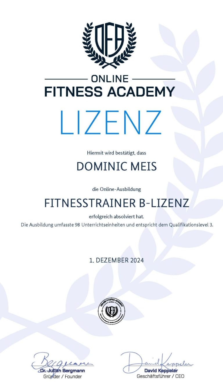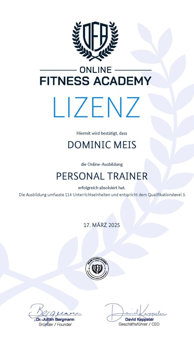 Um meine praktische Erfahrung mit fundiertem Fachwissen zu untermauern, habe ich im Jahr 2024 und 2025 meine verschiedenen Trainerlizenzen erworben. Damit verbinde ich heute Theorie und Praxis auf einem Niveau, das echte Ergebnisse liefert.
